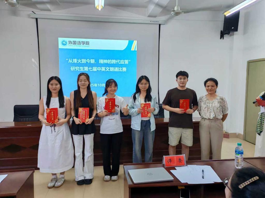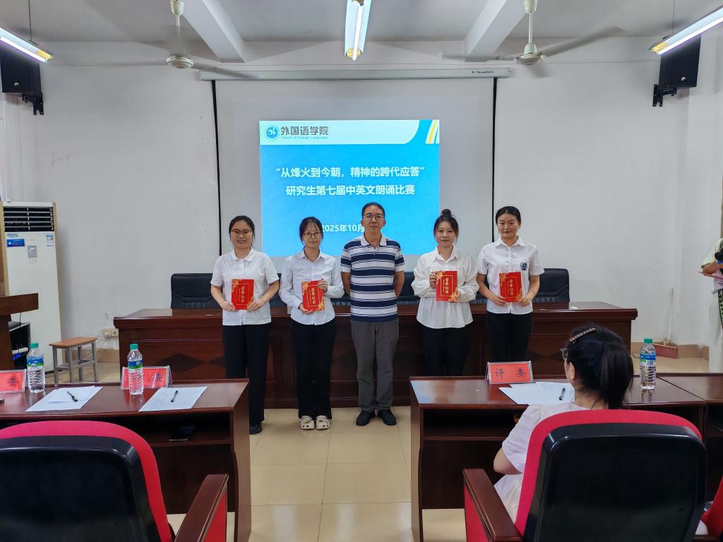 本次朗诵比赛不仅为我院研究生提供了展示自我、交流学习的平台,更以“跨代应答”为纽带,将历史记忆与青春使命紧密相连。未来,外国语学院将持续依托此类文化活动,推动外语与中文教学深度融合,助力学子在传承中创新、在表达中成长,为培养兼具家国情怀与国际视野的复合型人才注入更多活力。(图、文/严聆玮)