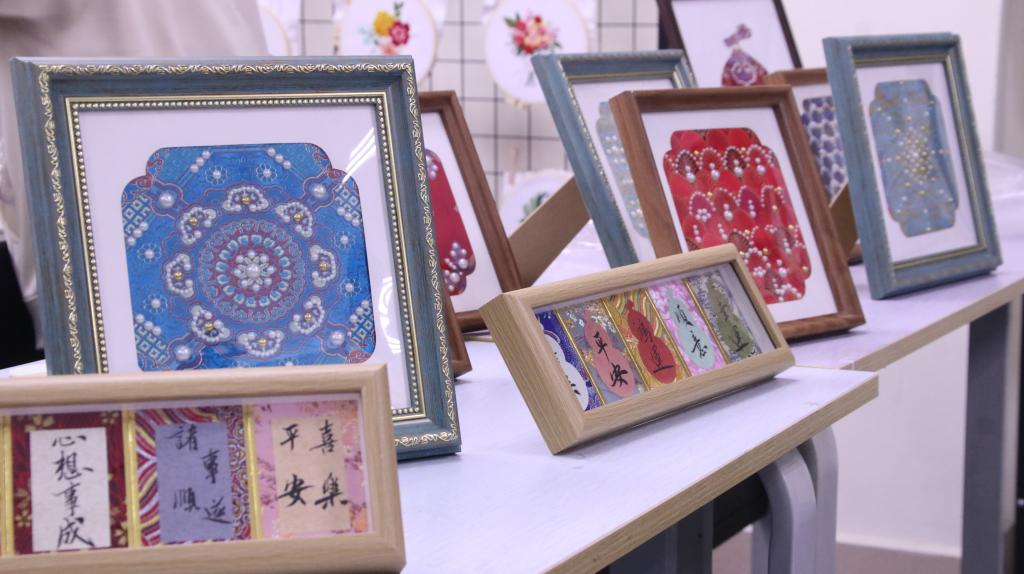 宋锦珍珠画制作现场创意十足。同学们将光泽温润的珍珠精心地粘贴在宋锦布料上,不一会儿,一幅幅兼具传统韵味与现代审美的作品逐渐成型。与此同时,漆扇制作环节最受师生青睐,我院党委书记肖桂芳也对此赞叹不绝。师生将天然大漆滴入水桶中,再轻转手腕,将扇面浸入桶中,大漆便自然流淌在扇面上,形成独一无二的纹理。