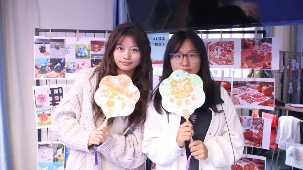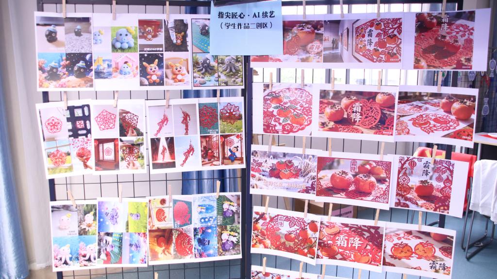 在“指尖匠心・AI续艺”展区,同学们将亲手制作的粘土、剪纸作品,与 AI 技术深度融合,为作品赋予了二次创作的新形态。观赏交流间,大家不仅加深了对“传统文化创造性表达”的理解,更强化了对中华优秀传统文化的认同感,创新实践的热情也随之进一步点燃。汉教233班吴丹同学感慨道:“没想到传统文化与AI能如此巧妙契合,这为我们创新文化表达提供了全新思路。”