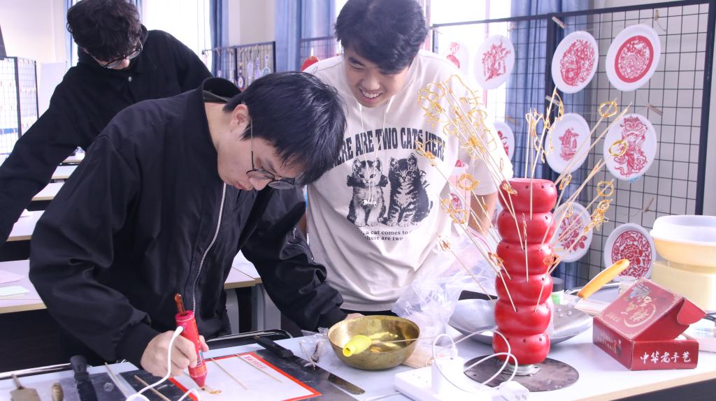 活动现场,糖画环节成为劳动教育的鲜活实践载体。学生志愿者首先演示了熬糖步骤,将固态糖块以小火慢熬成琥珀色糖浆,清晰展现了糖画制作的基础环节。随后,在志愿者指导下,参与者们使用热熔糖画笔进行糖画图案创作。这种“先演示传统、再用工具辅助”的贴心设计巧妙地降低了新手操作门槛,让每位同学都能轻松上手画糖画,在亲身体验中深刻感受到非遗技艺所蕴含的匠心与乐趣。