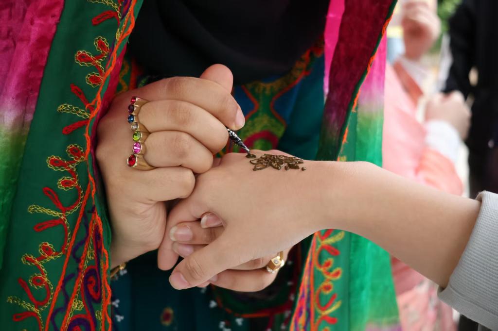 活动现场,各具特色的国家摊位成为学生感知世界文化的生动窗口。各摊位均设计了集章打卡机制,学生在完成语言挑战、手工制作、知识问答等任务后可兑换特色纪念品。在巴基斯坦展区,乌尔都语基础教学与精细繁复的海娜手绘吸引了大量同学驻足体验,浓厚的南亚风情跃然于指尖;英语摊位则变身“语言游乐场”,参与者们在绕口令速度比拼、英美俚语竞猜中妙趣横生,美式牛仔帽与哈利波特装饰更成为热门打卡点;日语摊位巧妙融合文化知识与趣味互动,从动漫经典台词竞猜到日汉字互译,再到鲷鱼烧与铜锣烧的美食品鉴,让人全方位领略东瀛文化的独特魅力;西班牙摊位以一曲奔放的弗拉门戈舞惊艳收尾,配以地道的Tapas小吃与西语知识问答,点燃了全场的南欧风情……