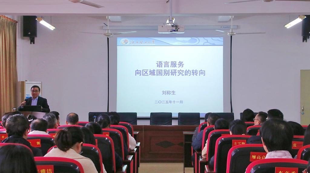 本网讯 为深入理解国家“十五五”规划关于加强国际传播与扩大教育开放的战略导向,探索外语学科发展新路径以及深化区域国别研究,11月18日下午,我院在学院楼C402成功举办区域国别研究系列学术讲座。本次讲座特邀刘称生教授担任主讲,以“语言服务向区域国别研究的转向”为题作专题报告。讲座由巴基斯坦研究中心承办,我院党委书记肖桂芳、副院长(主持工作)谢秋恩、党委副书记贺示婷、副院长李火秀、巴基斯坦研究中心主任程渊、院长助理刘绍晨与我院全体师生代表出席了此次讲座。
